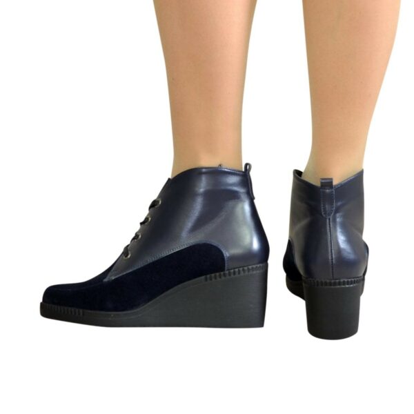 Класичні модні жіночі черевики на танкетці, виготовлені з натуральної синьої замші, комбіновані шкірою синього кольору. На шнурівці за допомогою якої регулюється підйом. Дуже зручні, ідеально сидять на ніжці – наголошують на Вашій індивідуальності.