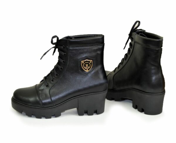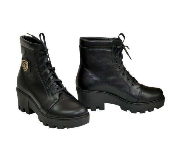 Модні стильні жіночі черевики на потовщеній підошві виготовлені з натуральної шкіри чорного кольору. Декоровані фурнітурою. Дуже зручні, ідеально сидять на ніжці – підкреслять вашу індивідуальність.