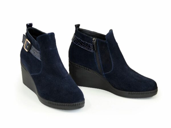 Класичні жіночі черевики на невисокій танкетці, виготовлені з натуральної замші синього кольору з ремінцем з натуральної лакової шкіри з тисненням "рептилії" та фурнітурою.