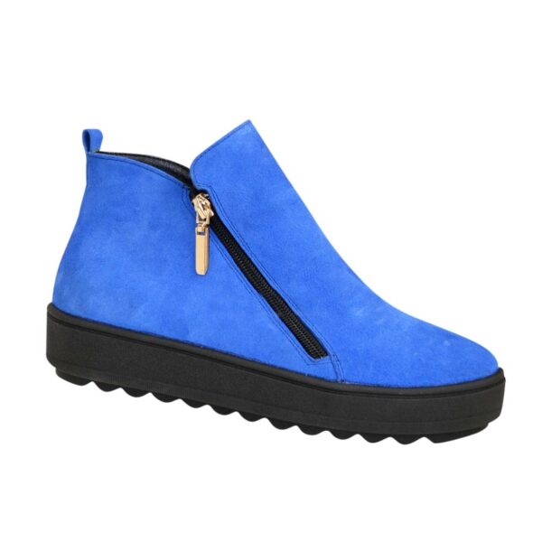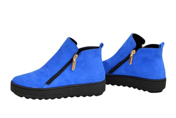 Жіночі стильні черевики на потовщеній підошві, низький хід, виготовлені з натуральної замші шкіряної колір електрик. Блискавка із зовнішньої та внутрішньої сторони служить для зручного взування.