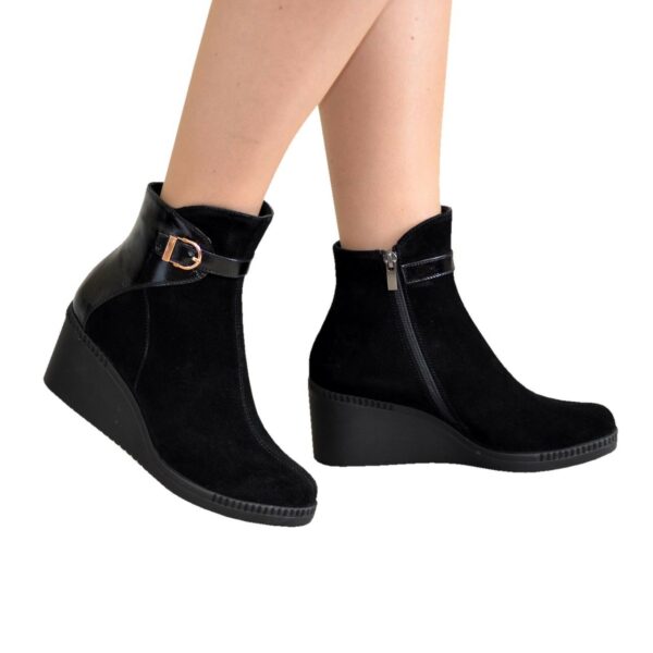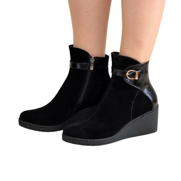 Жіночі черевики у класичному стилі з натуральної замші та лакової шкіри благородного чорного кольору на зручній стійкій танкетці. Висота з урахуванням танкетки – 21 см. Висота танкетки – 7 см, підошви попереду – 1,7 см. Охоплення верху – 25-27 см (залежно від розміру). Утеплювач – за бажанням замовника МЕХ ПОЛУШЕРСТЬ 70%, БАЙКА. Повномірні, відповідають стандартній сітці розміру. У нас працює послуга "індивідуальне виготовлення". Можливий відшив у шкірі, замші різних кольорів. Класичні черевики мають унікальну форму, тому чудово поєднуються з різними стилями в одязі. ТМ zlata-studio знайдемо підхід до кожного клієнта.