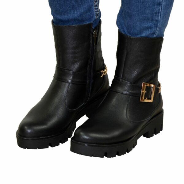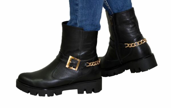 Модні стильні жіночі черевики на потовщеній підошві, виготовлені з натуральної шкіри чорного кольору. Декоровані ланцюгом та ремінцем. Дуже зручні, ідеально сидять на ніжці – підкреслять вашу індивідуальність.