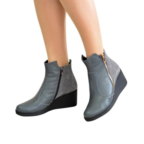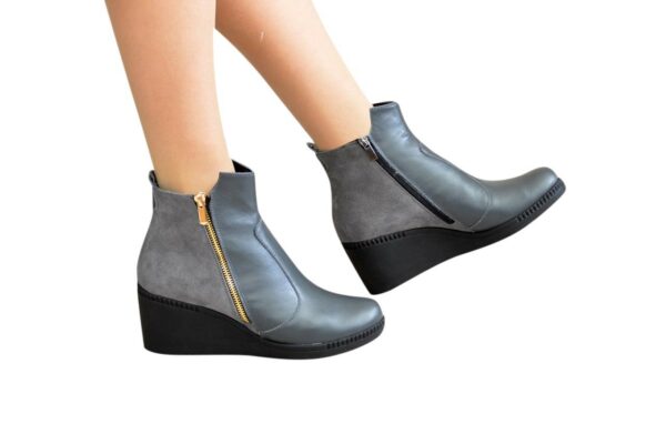 Класичні модні жіночі черевики на танкетці, виготовлені з натуральної шкіри, комбіновані натуральною замшею сірого кольору. Незамінні на кожен день, дуже зручні, ідеально сидять на ніжці – підкреслять вашу індивідуальність.