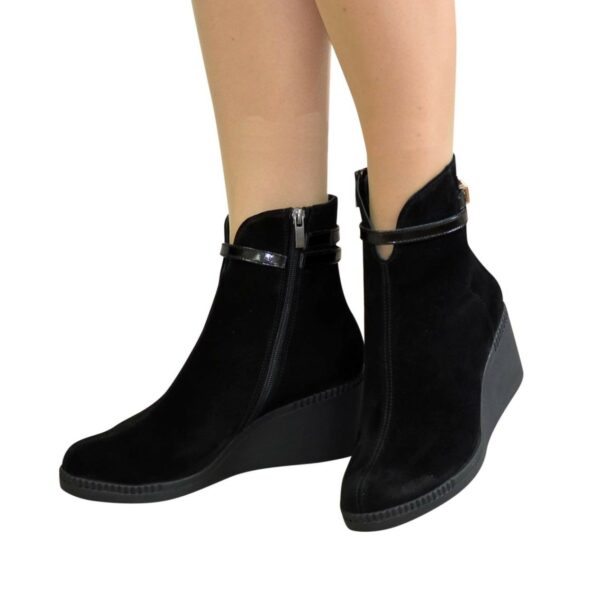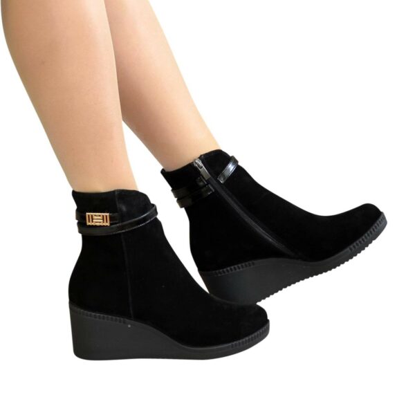 Модні жіночі черевики на танкетці, виготовлені з натуральної замші чорного кольору. Незамінні на кожен день, дуже зручні, ідеально сидять на ніжці – підкреслять вашу індивідуальність.