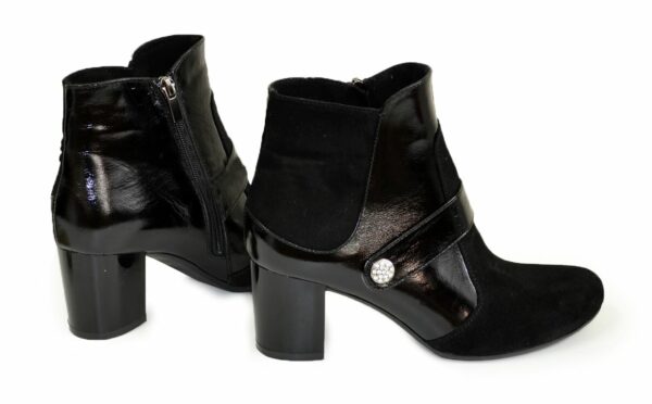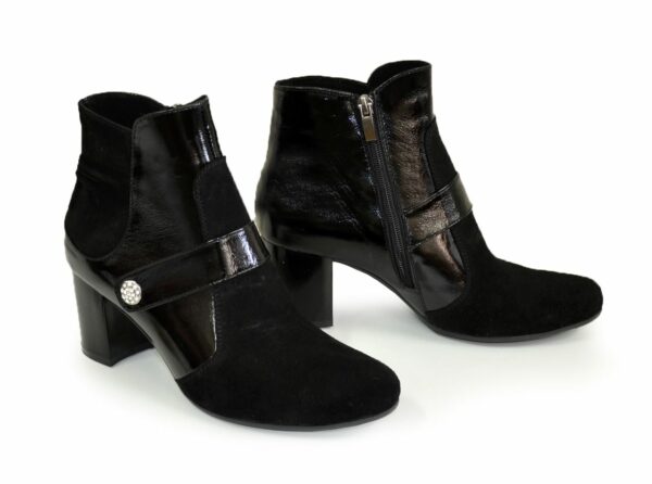 Черевики жіночі класичні на широкому стійкому підборі, виготовлені з натуральної замші чорного кольору, декоровані лаковими вставками, ремінцем та фурнітурою. Незамінні на кожен день, дуже зручні, практичні, ідеально сидять на ніжці – підкреслять Вашу індивідуальність.