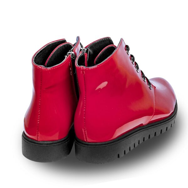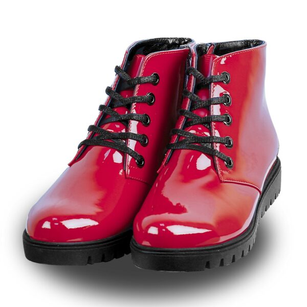 Класичні жіночі черевики на потовщеній підошві, виготовлені з натуральної лакової шкіри червоного кольору. З блискавкою та шнурівкою завдяки якій регулюється підйом. Дуже зручні, ідеально сидять на ніжці.