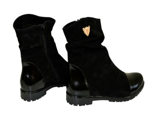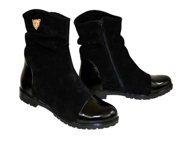 Стильні жіночі черевики на низькому ходу, виготовлені з натуральної чорної лакової шкіри та замші. На блискавці. Декоровані фурнітурою. Комфортні та акуратні, ідеально сидять на ніжці.