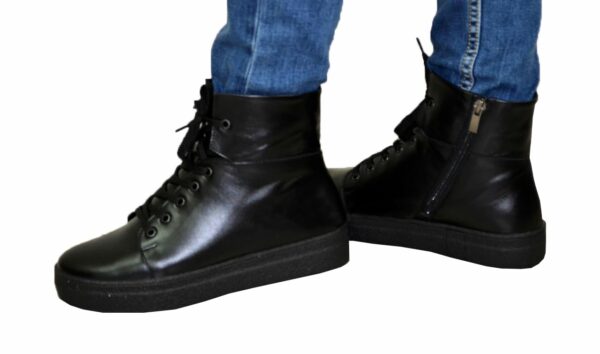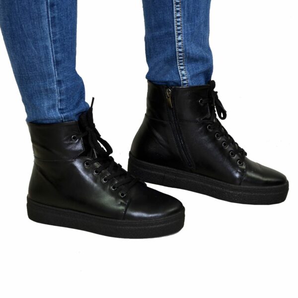 Стильні молодіжні жіночі черевики із натуральної шкіри чорного кольору, м'які зручні. На блискавці та шнурівці, яка допоможе відрегулювати підйом. Утеплювач – за бажанням замовника БАЙКА, хутро ПОЛУШЕРСТЬ 70%. Повномірні, відповідають стандартній сітці розміру. У нас працює послуга "індивідуальне виготовлення". Можливий відшив у шкірі, замші різних кольорів. Класичні