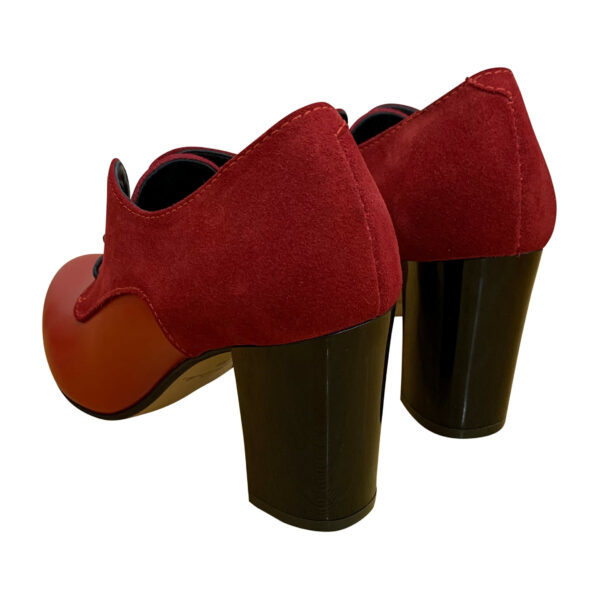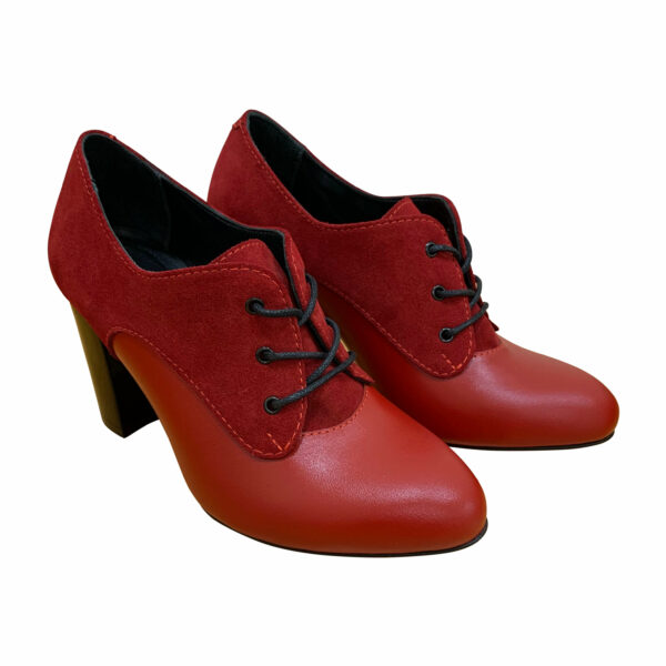 Закриті жіночі туфлі з натуральної шкіри та замші червоного кольору, на високих стійких підборах висота 8.5 см. Ручної роботи, з використанням виключно натуральних матеріалів високої якості. Повномірні, відповідають стандартній сітці розміру. Розраховані на стандартну повноту стегна. Можливий відшив у шкірі, замші різних кольорів.
