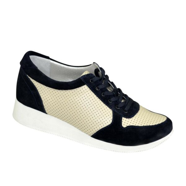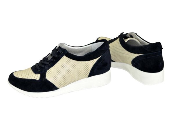 Класичні, комфортні кросівки виготовлені з натуральної шкіри бежевого кольору та натуральної замші синього кольору. З м'яким кантом та м'якою мовою. Чудово сидять на ніжці. Повномірні, відповідають стандартній сітці розміру. Розраховані на різну повноту ноги завдяки шнурівці. Можливий відшив у шкірі, замші різних кольорів.
