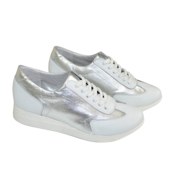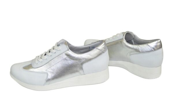 Полегшені, комфортні кросівки виготовлені з натуральної шкіри білого та срібного кольору. З м'яким кантом та м'якою мовою. Чудово сидять на ніжці. Повномірні, відповідають стандартній сітці розміру. Розраховані на різну повноту ноги завдяки шнурівці. Можливий відшив у шкірі, замші різних кольорів.