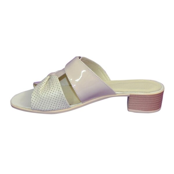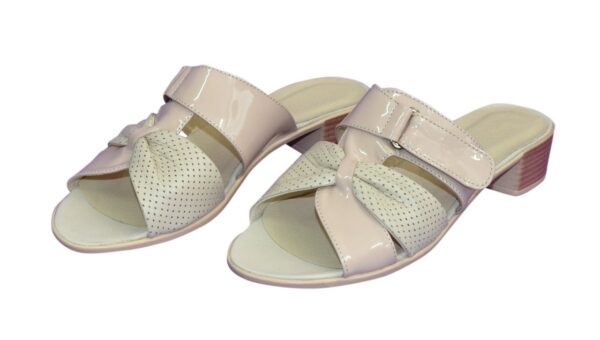 Зручні шльопанці на легкій поліуретановій підошві зі стійким підбором 3.5см, з натуральної лакової та перфорованої шкіри бежевого кольору, повномірні відповідають стандартній розмірній сітці. Підйом регулюється липучкою, підійде на повну ногу. Можливий відшив у шкірі, замші різних кольорів.