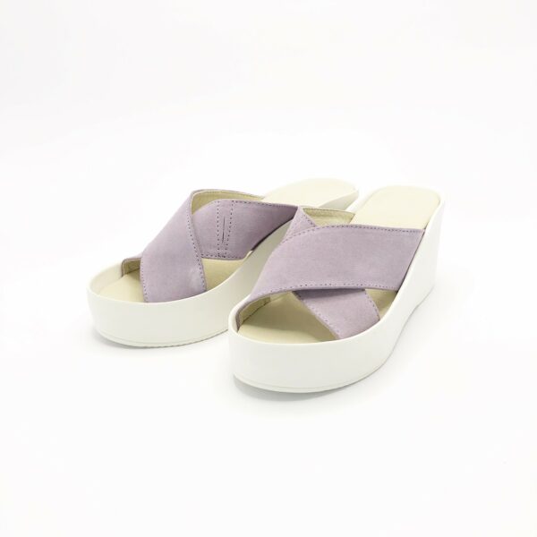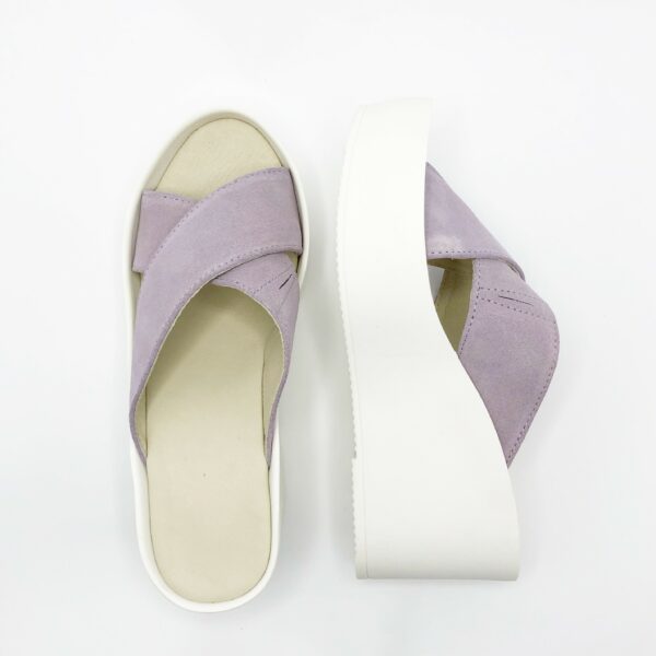Стильні зручні шльопання на полегшеній поліуретановій підошві платформа 8 см, попереду 4 см., з натуральної замші бузкового кольору, м'яка устілка обтягнута світлою шкірою, відповідають стандартній сітці розмірної. Можливий відшив у шкірі, замші різних кольорів.