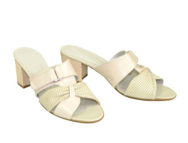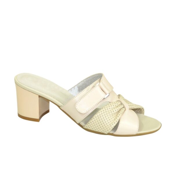 Літні шльопанці на моно блоковій підошві з лаковим каблуком 6.5см, з натуральної шкіри бежевого кольору, повномірні відповідають стандартній сітці. Підйом регулюється липучкою, підійде на повну ногу. Можливий відшив у шкірі, замші різних кольорів.
