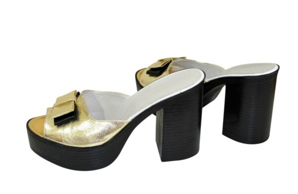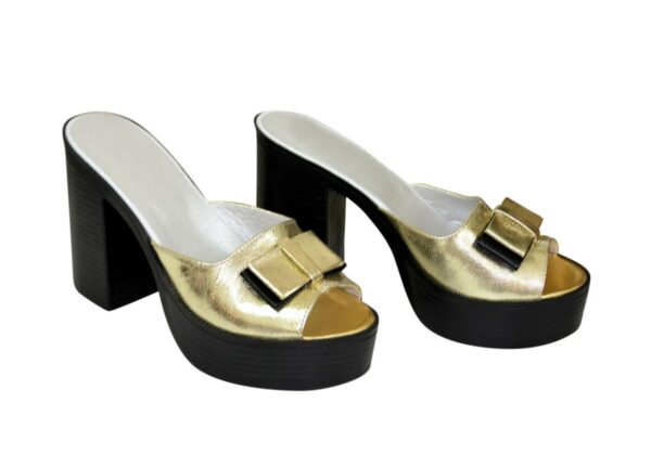 Стильні сабо на масивній поліуретановій підошві висота каблука 11 см, попереду 3,5 см. з натуральної шкіри золотого та чорного кольору. Відповідають стандартній розмірній сітці. Можливий відшив у шкірі, замші різних кольорів.