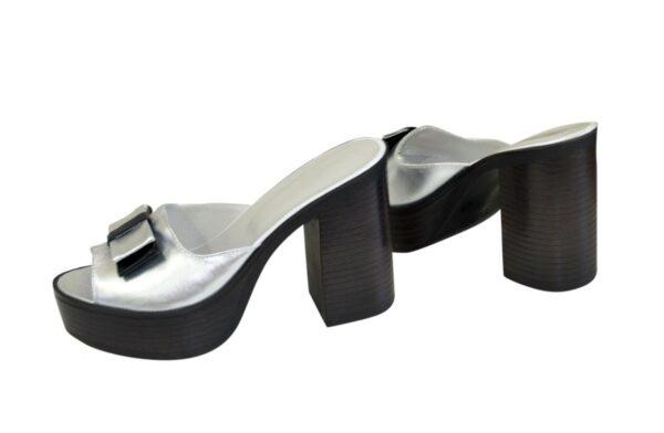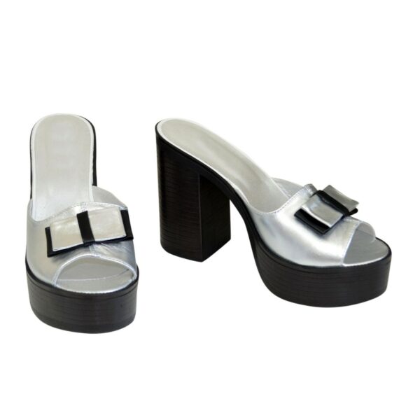 Стильні сабо на масивній поліуретановій підошві висота каблука 11 см, попереду 3,5 см. з натуральної шкіри срібного та чорного кольору. Відповідають стандартній розмірній сітці. Можливий відшив у шкірі, замші різних кольорів.