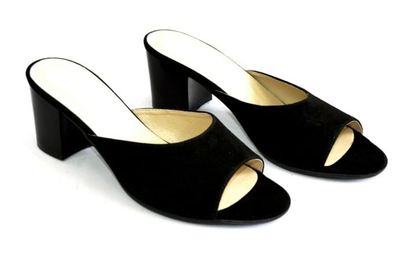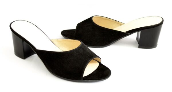 Елегантні сабо з натуральної замші чорного кольору на стійкому лаковому підборі 5.5см. з гумкою, повномірні відповідають стандартній сітці розміру. Можливий відшив у шкірі, замші різних кольорів.