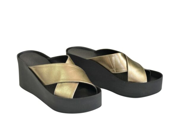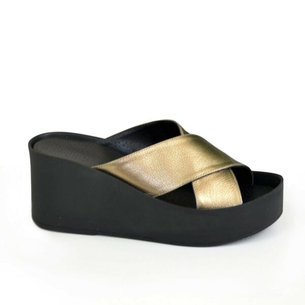 Зручні шльопання на легкій поліуретановій підошві Платформа 8 см, попереду 4 см. , з натуральної шкіри бронзового кольору, м'яка устілка обтягнута шкірою чорного кольору, з резинкою відповідають стандартній сітці. Можливий відшив у шкірі, замші різних кольорів.