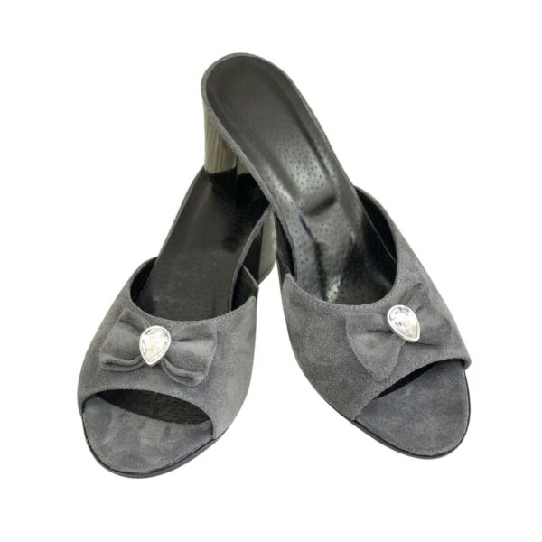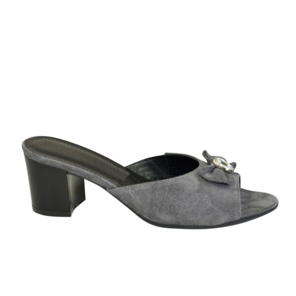 Елегантні сабо, з натуральної замші сірого кольору, з декорацією з банта та фурнітури, на стійкому лаковому підборі 5.5 см. є гумка, повномірні відповідають стандартній розмірній сітці. Можливий відшив у шкірі, замші різних кольорів.