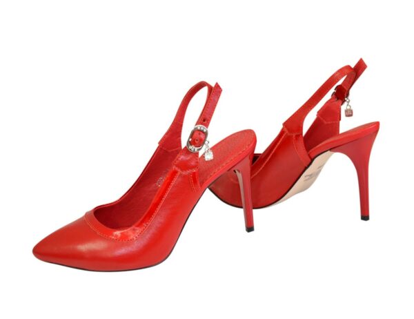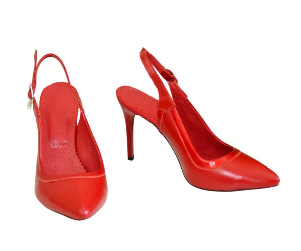 Витончені жіночі босоніжки-туфлі з гострим носком на шпильці 9.5 см. підошва блокова. Зі шкіри червоного кольору з окантовкою з лакової шкіри червоного кольору. Повномірні, розраховані на стандартну повноту стегна. Відповідають стандартній розмірній сітці. Можливий відшив у шкірі, замші різних кольорів.