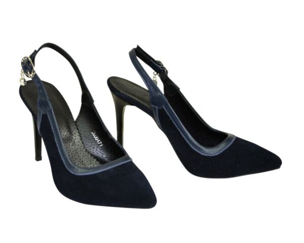 Витончені жіночі босоніжки-туфлі з гострим шкарпеткою на шпильці 9.5 см. підошва блочна. З натуральної замші синього кольору з окантовкою зі шкіри синього кольору. Повномірні, розраховані на стандартну повноту стегна. Відповідають стандартній розмірній сітці. Можливий відшив у шкірі, замші різних кольорів.