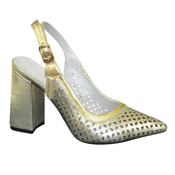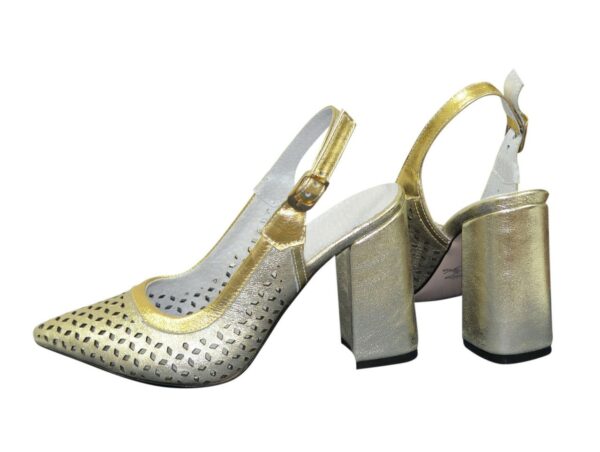 Витончені жіночі босоніжки-туфлі з гострим носком на обтяжному підборі 10 см. підошва блочна. Зі натуральної шкіри золотого кольору з наскрізною перфорацією. Повномірні, розраховані на стандартну повноту стегна. Відповідають стандартній розмірній сітці. Можливий відшив у шкірі, замші різних кольорів.