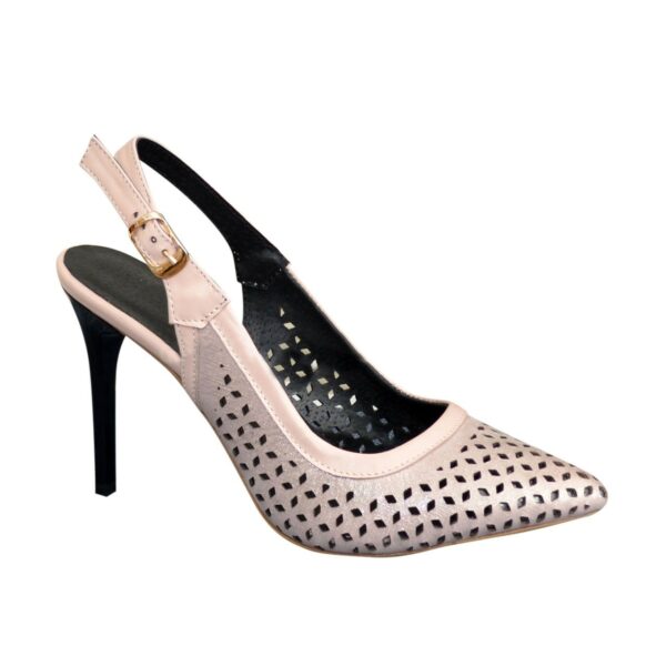 Витончені жіночі босоніжки-туфлі з гострим шкарпеткою на шпильці 9.5 см. підошва блочна. З натуральної шкіри рожевого кольору із наскрізною перфорацією. Повномірні, розраховані на стандартну повноту стегна. Відповідають стандартній розмірній сітці. Можливий відшив у шкірі, замші різних кольорів.