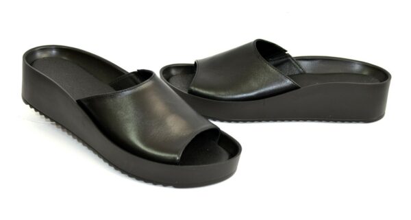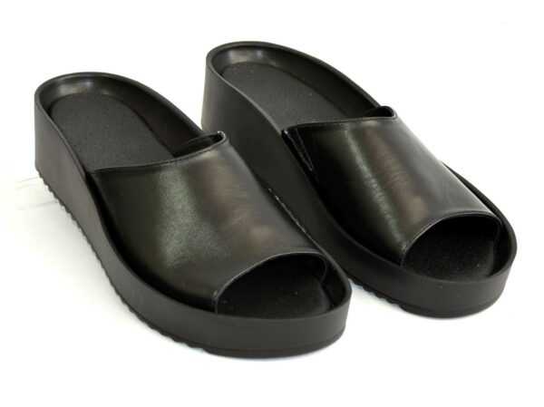 Зручні шльопання на легкій поліуретановій підошві, з натуральної шкіри чорного кольору, з гумкою, м'яка устілка обтягнута чорною шкірою, відповідають стандартній сітці розмірної. На вузьку та середню ногу. Можливий відшив у шкірі, замші різних кольорів.