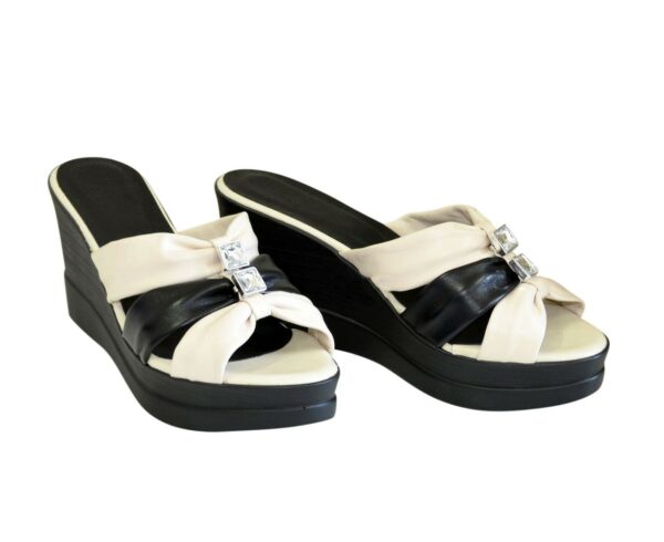 Оригінальні шльопанці на легкій поліуретановій танкетці висота 9см, з натуральної шкіри бежевого та чорного кольору, з декорацією з фурнітури, повномірні відповідають стандартній сітці розмірної. Можливий відшив у шкірі, замші різних кольорів.