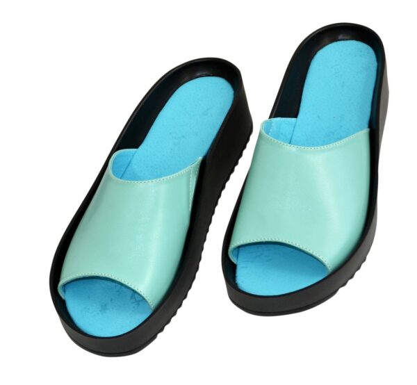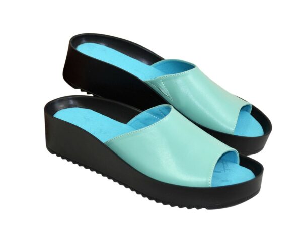 Зручні шльопання на легкій поліуретановій підошві, з натуральної шкіри м'ятного кольору, з гумкою, м'яка устілка обтягнута світлою шкірою, відповідають стандартній сітці. На вузьку та середню ногу. Можливий відшив у шкірі, замші різних кольорів.