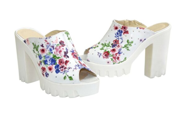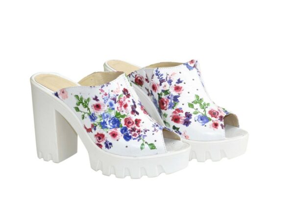 Класичні жіночі сабо з відкритим носком, на білій тракторній підошві Висота каблука 10,5 см, попереду 2,5 см. з натуральної білої шкіри з квітковим принтом, з гумкою відповідають стандартній сітці розмірної. Повномірні, розраховані на стандартну повноту стегна. Можливий відшив у шкірі, замші різних кольорів.