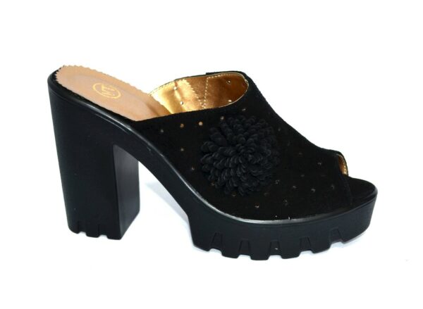 Класичні жіночі сабо з відкритим носком, на полегшеній поліуретановій тракторній підошві Висота каблука 10,5 см, попереду 2,5 см. із натуральної замші чорного кольору, з резинкою відповідають стандартній сітці. Повномірні, розраховані на стандартну повноту стегна. Можливий відшив у шкірі, замші різних кольорів.