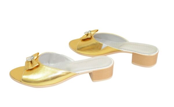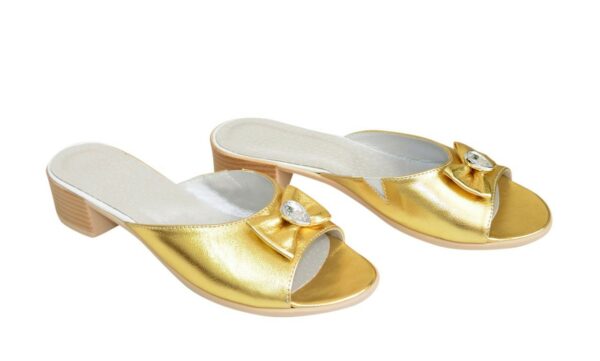 Елегантні сабо з натуральної шкіри золотистого кольору, з декорацією з банта та фурнітури, на полегшеній поліуретановій підошві з каблуком 3.5см. з гумкою, повномірні відповідають стандартній сітці розміру. Можливий відшив у шкірі, замші різних кольорів.