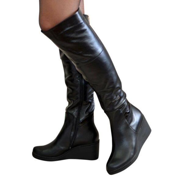 Стильні жіночі ботфорти із натуральної шкіри чорного кольору, з гумкою у верхній частині чобота, на танкетці.