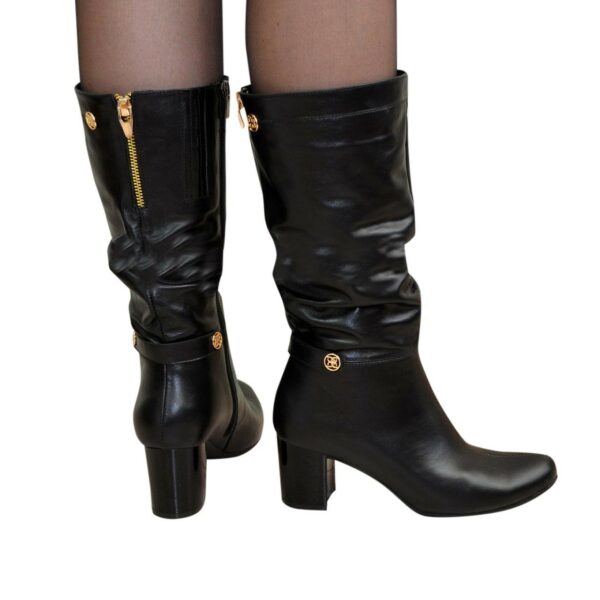 Стильні жіночі чоботи із натуральної шкіри чорного кольору, з гумкою у верхній частині чобота. На стійкому підборі. Обсяг гомілки можна замовити від 35 см до 40 см для будь-якого розміру.
