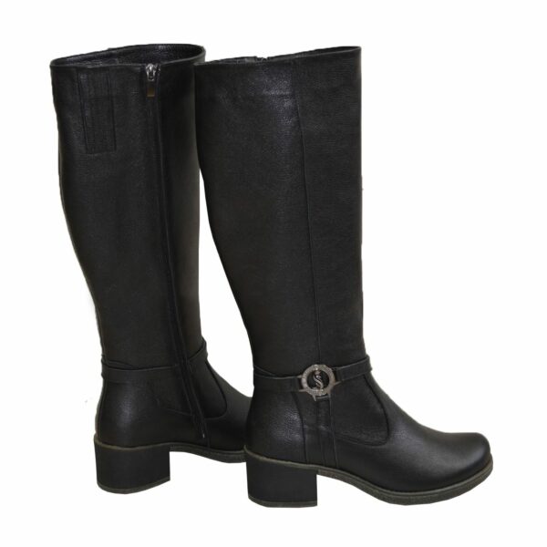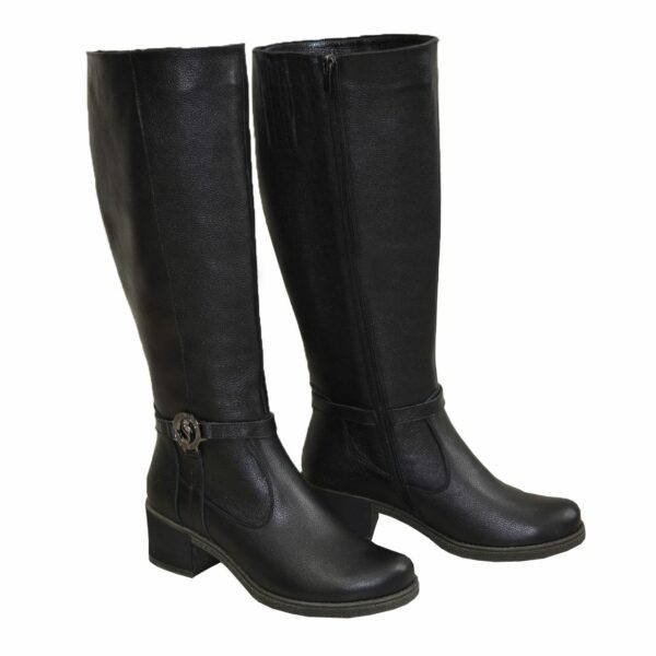 Класичні жіночі чоботи з натуральної шкіри чорного кольору, зручні, практичні, декоровані ремінцем та фурнітурою, на невисокому стійкому підборі. Об'єм гомілки можна замовити для будь-якого розміру.
