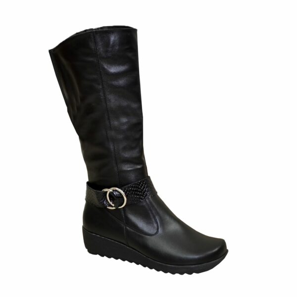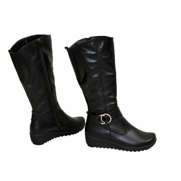 Зручні та практичні жіночі чоботи із натуральної шкіри чорного кольору на танкетці. Декоровані ремінцем. Об'єм гомілки можна замовити для будь-якого розміру.