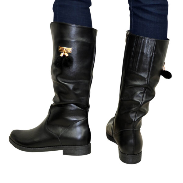 Жіночі чоботи виготовлені із натуральної шкіри чорного кольору на низькому ходу. Декоровані фурнітурою. Дуже зручні, ідеально сидять на ніжці.