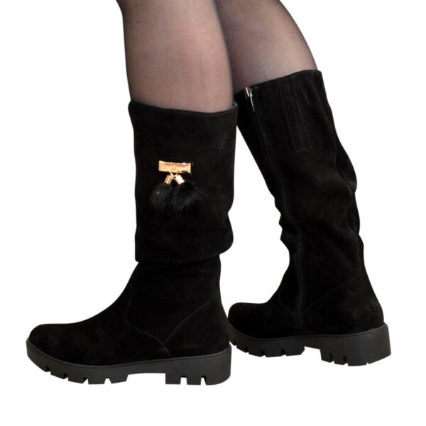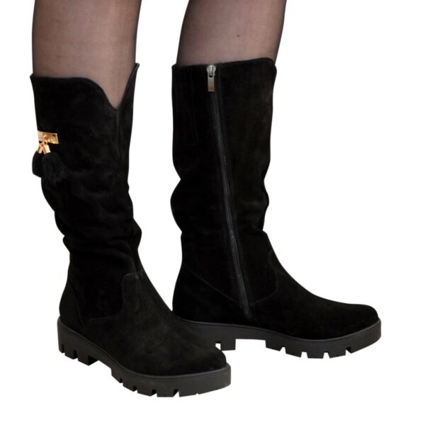 Жіночі чоботи виготовлені із натуральної замші чорного кольору на потовщеній підошві. Декоровані фурнітурою. Дуже зручні, ідеально сидять на ніжці.
