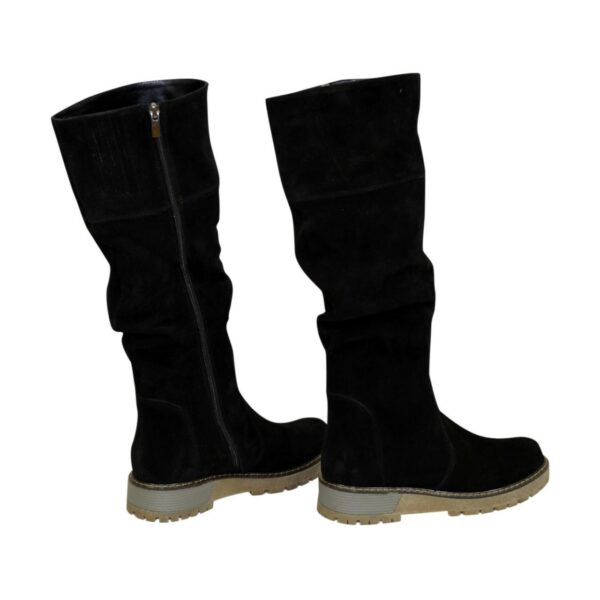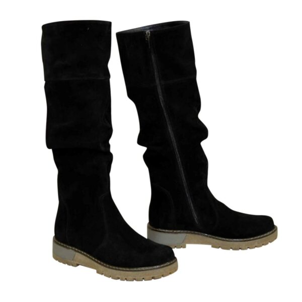 Стильні жіночі чоботи з натуральної замші чорного кольору з гумкою верхньої частини чобота на потовщеній підошві.