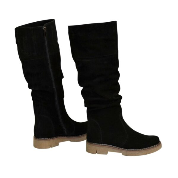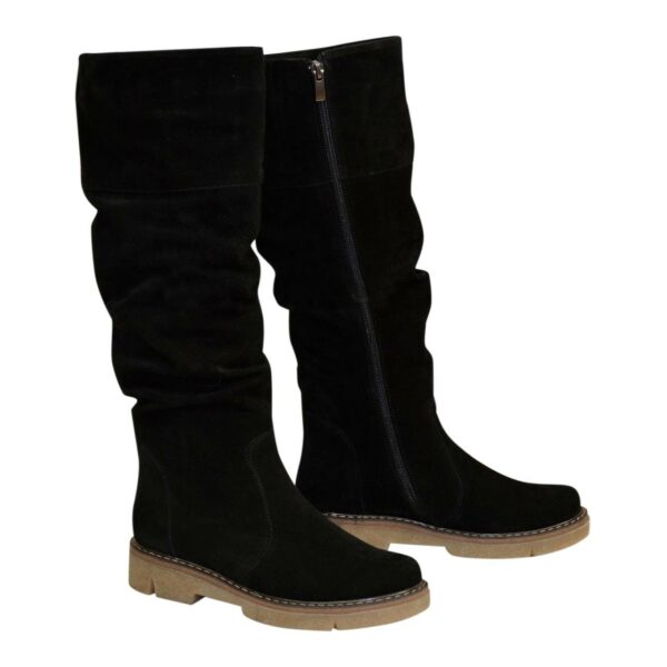 Стильні жіночі чоботи з натуральної замші чорного кольору з гумкою верхньої частини чобота на потовщеній підошві.