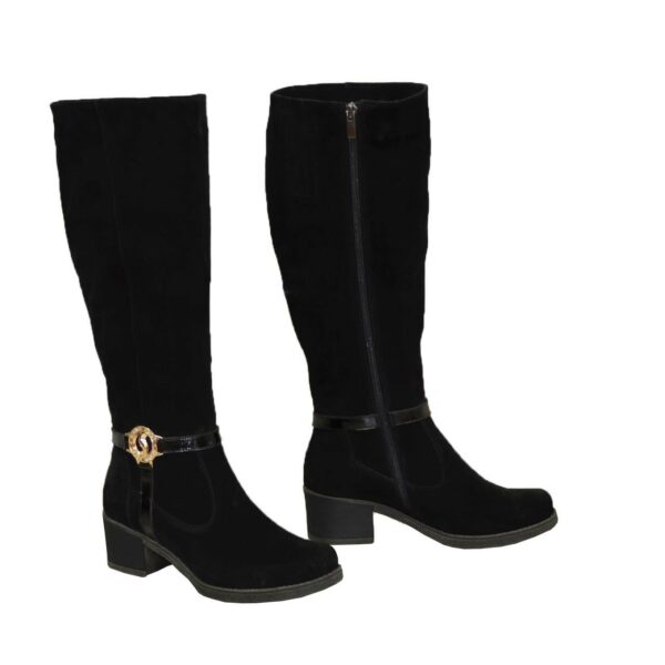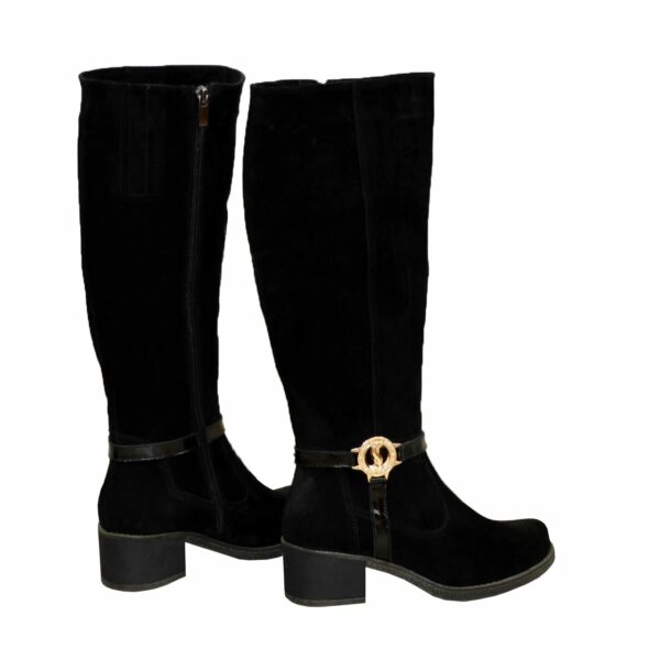 Класичні жіночі чоботи з натуральної замші чорного кольору, зручні, практично декоровані ремінцем і фурнітурою, на невисокому стійкому підборі. Об'єм гомілки можна замовити для будь-якого розміру.