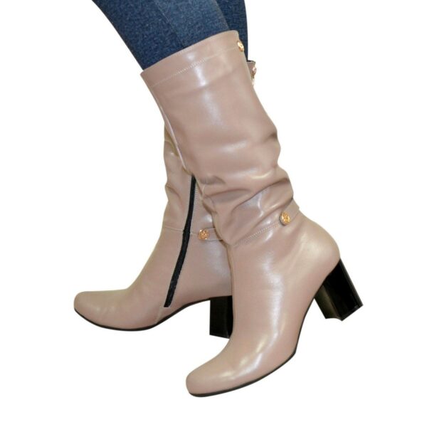 Стильні жіночі чоботи із натуральної шкіри кольору візон, з гумкою у верхній частині чобота. На стійкому підборі. Обсяг гомілки можна замовити від 35 см до 40 см для будь-якого розміру.