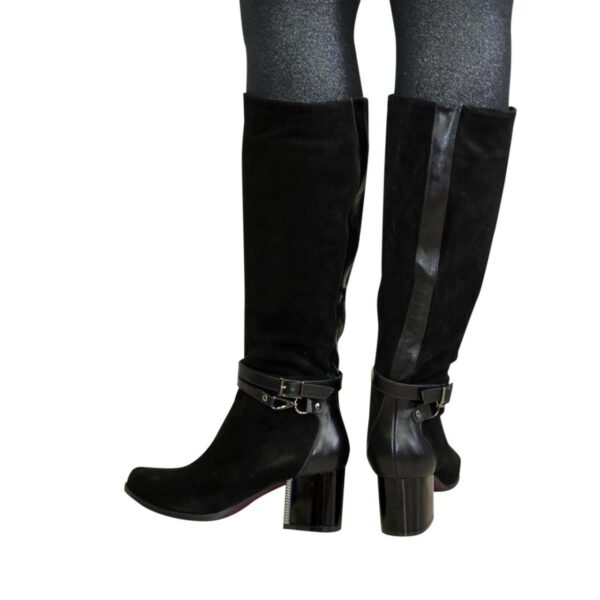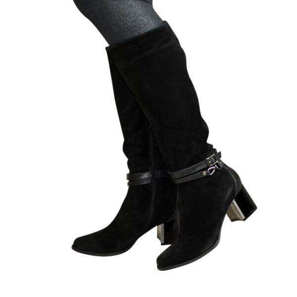 Стильні жіночі чоботи з натуральної замші та шкіри чорного кольору, з гумкою у верхній частині чобота, на стійкому підборі.