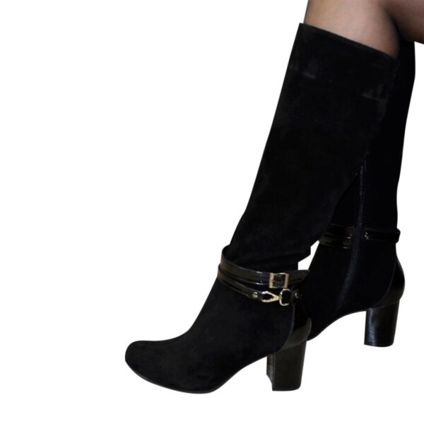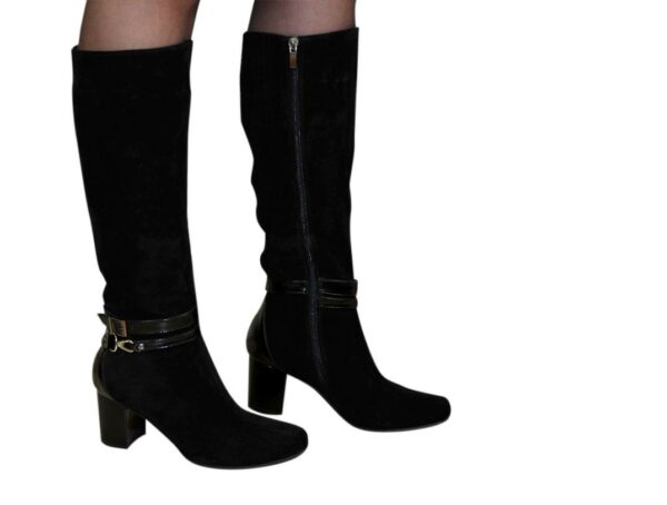 Стильні жіночі чоботи з натуральної замші та лакової шкіри чорного кольору, з гумкою у верхній частині чобота, на стійкому підборі.