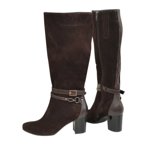 Стильні жіночі чоботи з натуральної замші та шкіри коричневого кольору, з гумкою у верхній частині чобота, на стійкому підборі.