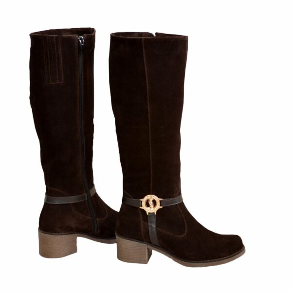 Класичні жіночі чоботи з натуральної замші коричневого кольору, зручні, практичні, декоровані ремінцем і фурнітурою, на невисокому стійкому підборі. Об'єм гомілки можна замовити для будь-якого розміру.