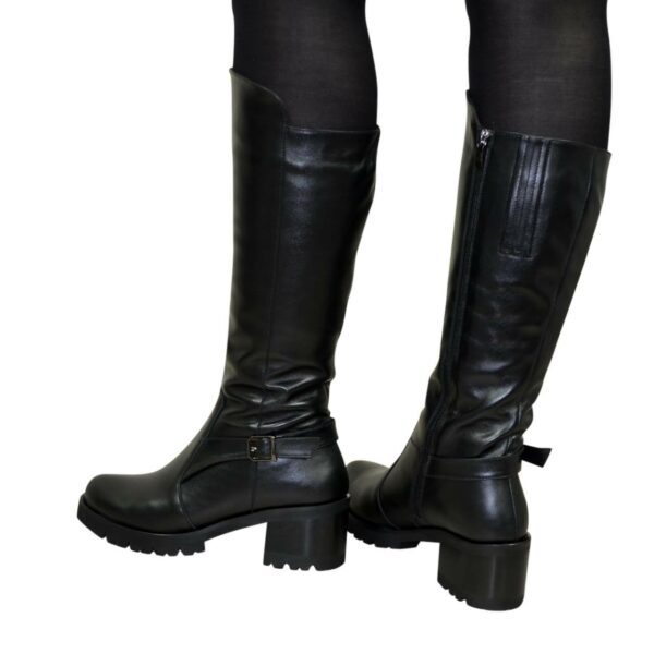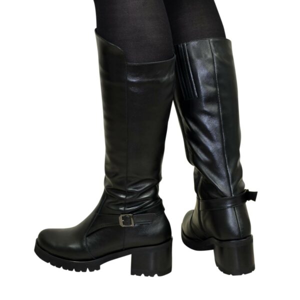 Стильні жіночі чоботи з натуральної шкіри чорного кольору, декоровані ремінцем, на невисокому широкому стійкому підборі. Об'єм гомілки можна замовити для будь-якого розміру.