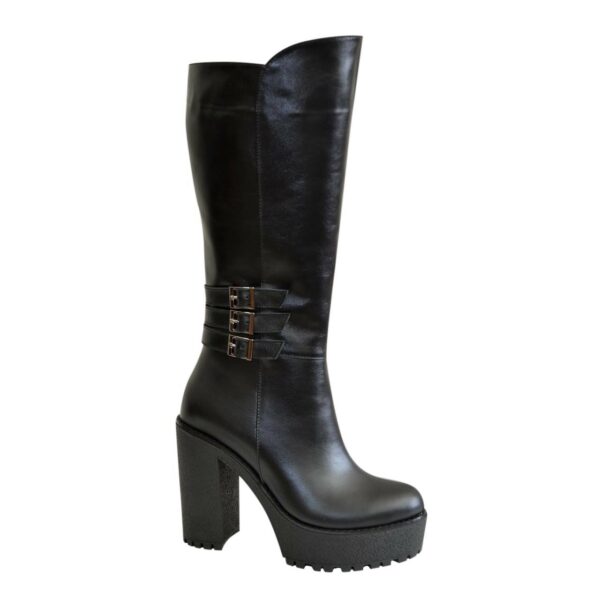Класичні жіночі чоботи з натуральної шкіри чорного кольору, декоровані ремінцями на халяву є широка вшита гумка збоку чобота для додаткового об'єму гомілки, гарні зручні, практичні та стильні на високому стійкому підборі. Об'єм гомілки можна замовити для будь-якого розміру.