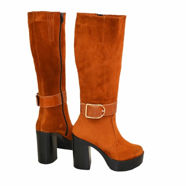 Класичні жіночі чоботи з натуральної замші рудого кольору, декоровані ремінцем, з натуральної рудої шкіри, на халяву є широка вшита гумка збоку чобота для додаткового об'єму гомілки, красиві, зручні та стильні, на високому стійкому підборі. Декоровані фурнітурою. Об'єм гомілки можна замовити для будь-якого розміру.